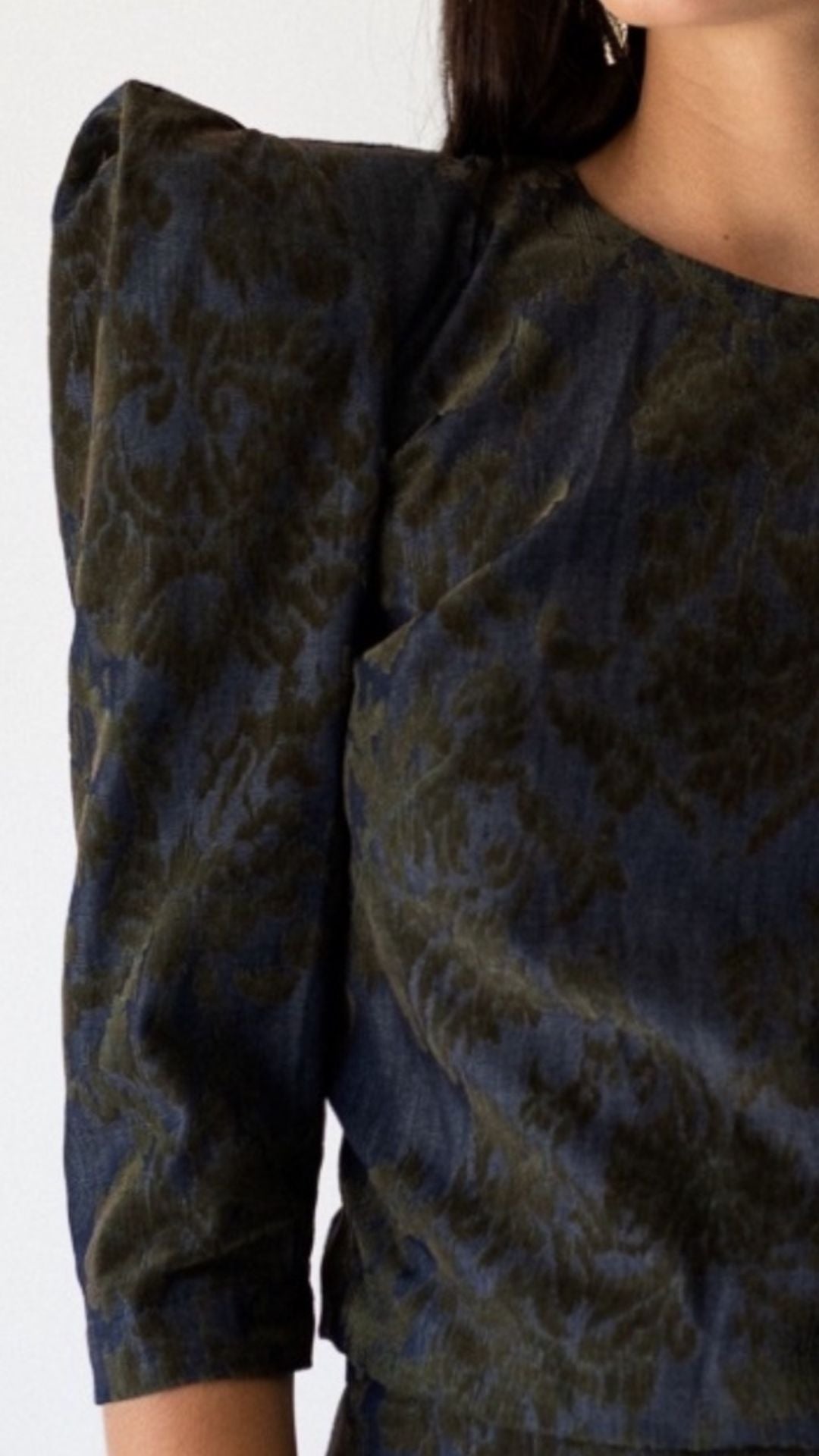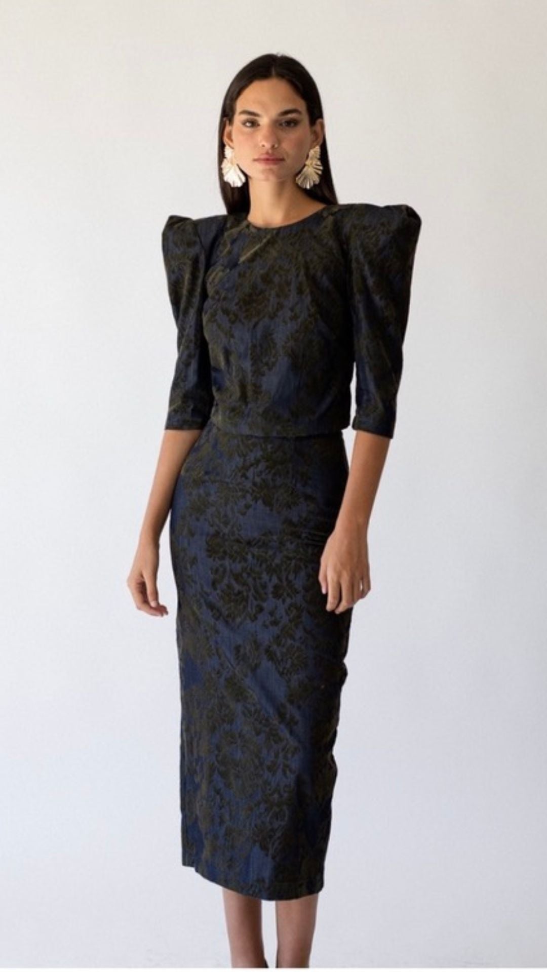 Elegante conjunto para tus eventos de Otoño/Invierno, con una textura super especial de base azul noche con brocado superpuesto de terciopelo en verde oliva.