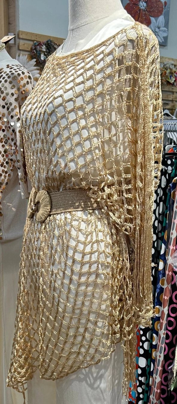 Poncho metalizado en punto de red. Ideal para llevar encima de vestidos, camisetas, blusas, o incluso encima del bañador. Pruébalo también con cinturón.